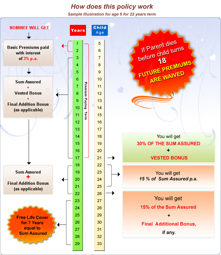 • In-built Premium Waiver Benefit. All balance premiums waived if parent dies before the premium paying term ends