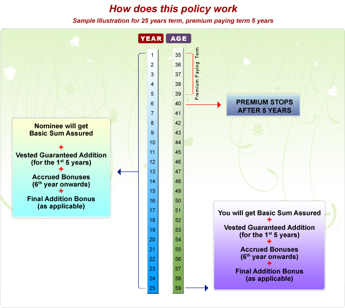 • On Maturity of the term: Sum Assured + Guaranteed Additions for the 1st 5 years + Accrued bonuses declared from 6th year onwards (as applicable) + Final Addition Bonus (as applicable) will be paid.