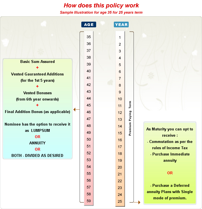 Basic Sum Assured along with accrued Guaranteed Addition shall be paid as lump sum or in the form of an annuity or partly in lump sum and balance in the form of an annuity to the nominee.