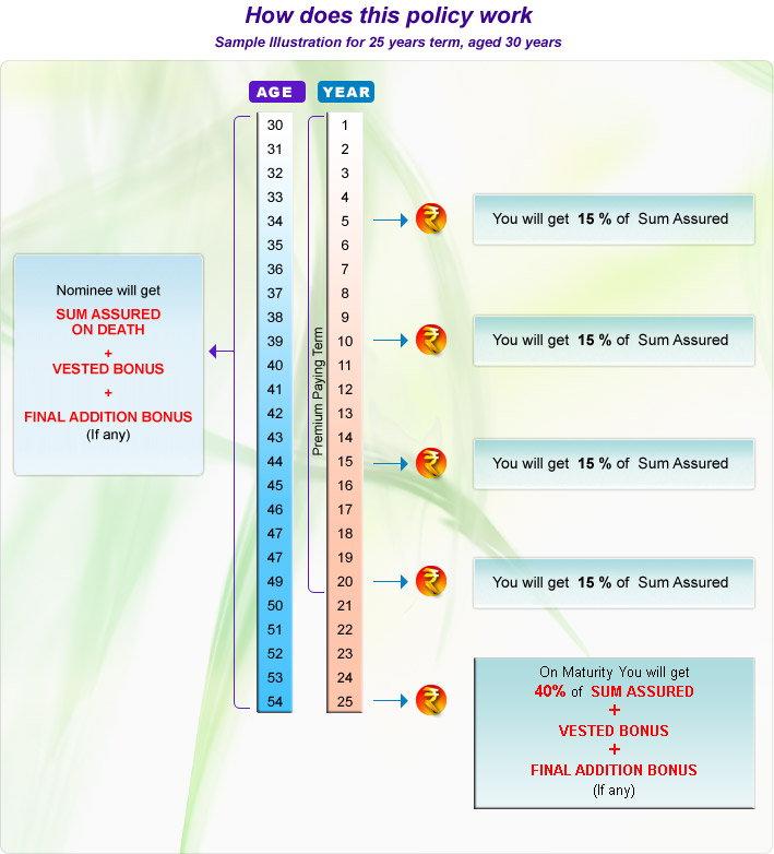In case of Life Assured surviving to the end of the specified durations 15% of the Basic Sum Assured at the end of each of 5th, 10th, 15th & 20th policy year.