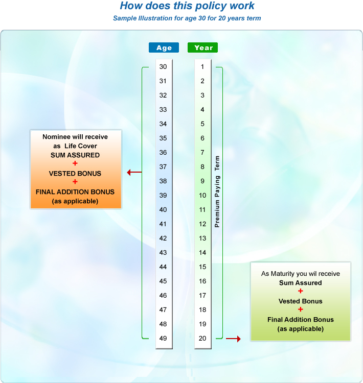 • On maturity of the term, Sum Assured + Bonus + Terminal Bonus (as applicable) will be paid.